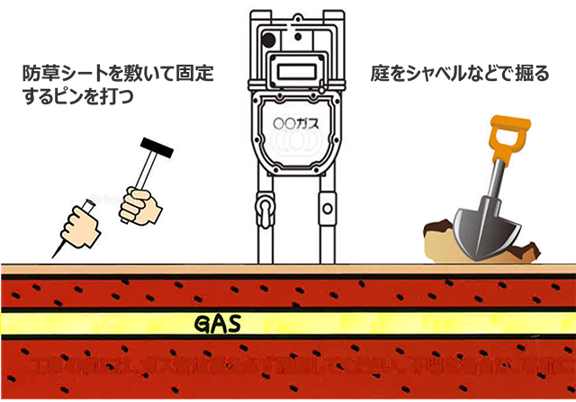 住宅の敷地内には、ガス管が埋設されている部分があります。以下の作業を行うときにはガス管を損傷しないようご確認をお願いします。