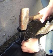 - 防草シートを敷いて固定する杭を打つ